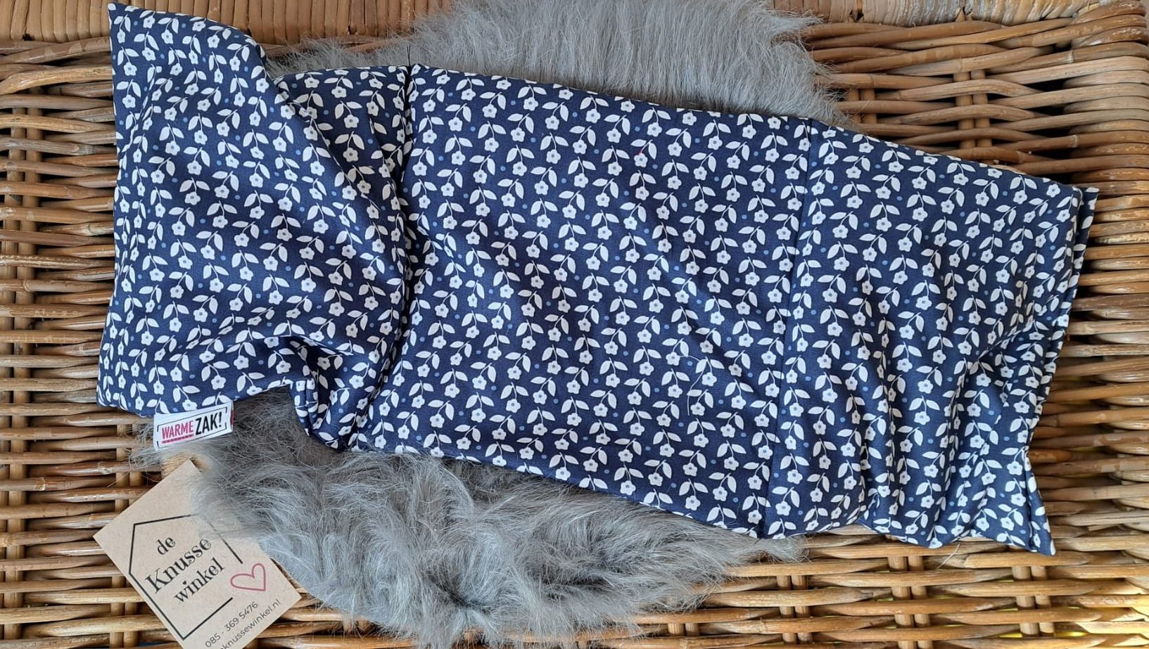 Rustgevend en stijlvol: de Warmezak! met blauwe stof en witte bloemenprint combineert natuurlijke charme met praktisch comfort. Ideaal voor wie warmte of verkoeling zoekt in een mooie, zachte verpakking.