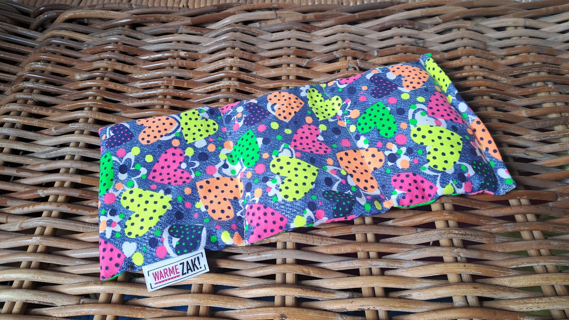 De opvallende hartjesprint in neonkleuren maakt deze Warmezak niet alleen praktisch, maar ook leuk en speels – ideaal als cadeautje of troostzakje voor kinderen.